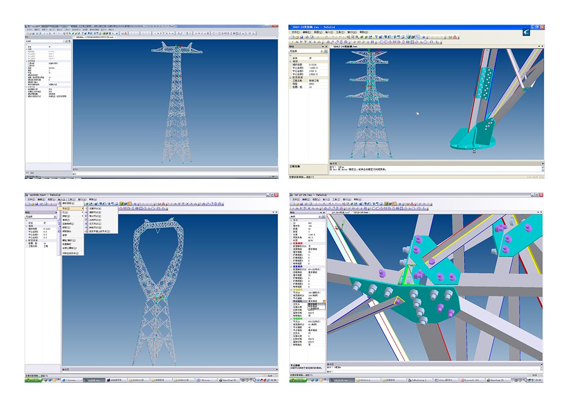 我公司采用《TwSolid塔架式鋼結(jié)構(gòu)三維實體放樣軟件》,完全參數(shù)化設(shè)計,三維互動修改,任意修改控制尺寸、塔材規(guī)格和依存關(guān)系等參數(shù),全塔自動實時跟隨調(diào)整。放樣數(shù)據(jù)準確(所見即所得),模擬了鐵塔的安裝,準確地反映了鐵塔的空間碰撞,及做出正確的切角方案。